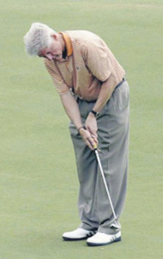 In hellen Hosen und einem orange gestreiften Poloshirt verbrachte er fünf Stunden auf dem grünen Teppich und aß zwischen den Löchern ein paar Schinken-, Käse- und Thunfischsandwiches, die er mit einer Diät-Cola hinunterspülte. Die Köstlichkeiten des baskischen Kochs Martín Berasategui – Zackenbarsch, Paprika, Kartoffeln, Mojo-Sauce, Käse und Obstsalat – ließ er sich kaum schmecken.